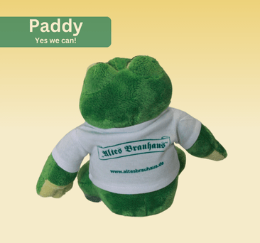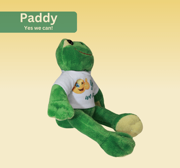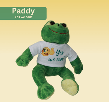 Paddy ist ein weicher, grüner Plüschfrosch mit einem freundlichen Lächeln. Er trägt ein hochwertiges weißes T-Shirt mit der motivierende Aufschrift „Yes we can!“. Seine glänzenden Augen und sein kuscheliges Material machen ihn zum perfekten Freund für Groß und Klein.